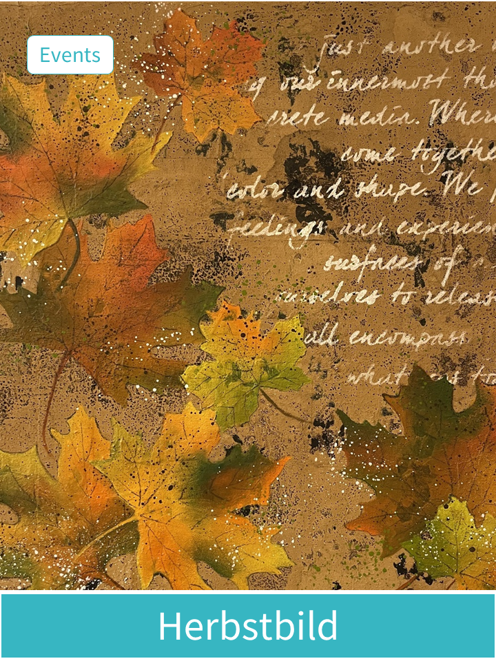 - Wir arbeiten in Mixed-Media-Technik: Mit Acrylfarbe, Asche und Bitumen gestalten wir einen abstrakten Hintergrund und tragen anschliessend Schrift und Blätter auf. Du kannst die Blätter frei oder mit einer Schablone aufs Bild bringen.